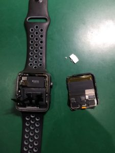 写真はAppleWatchseries2のガラス割れになります。液晶サイズにきれいに割れてしまい、本体と液晶がフラットケーブルで宙ぶらりんになっている状態でした。